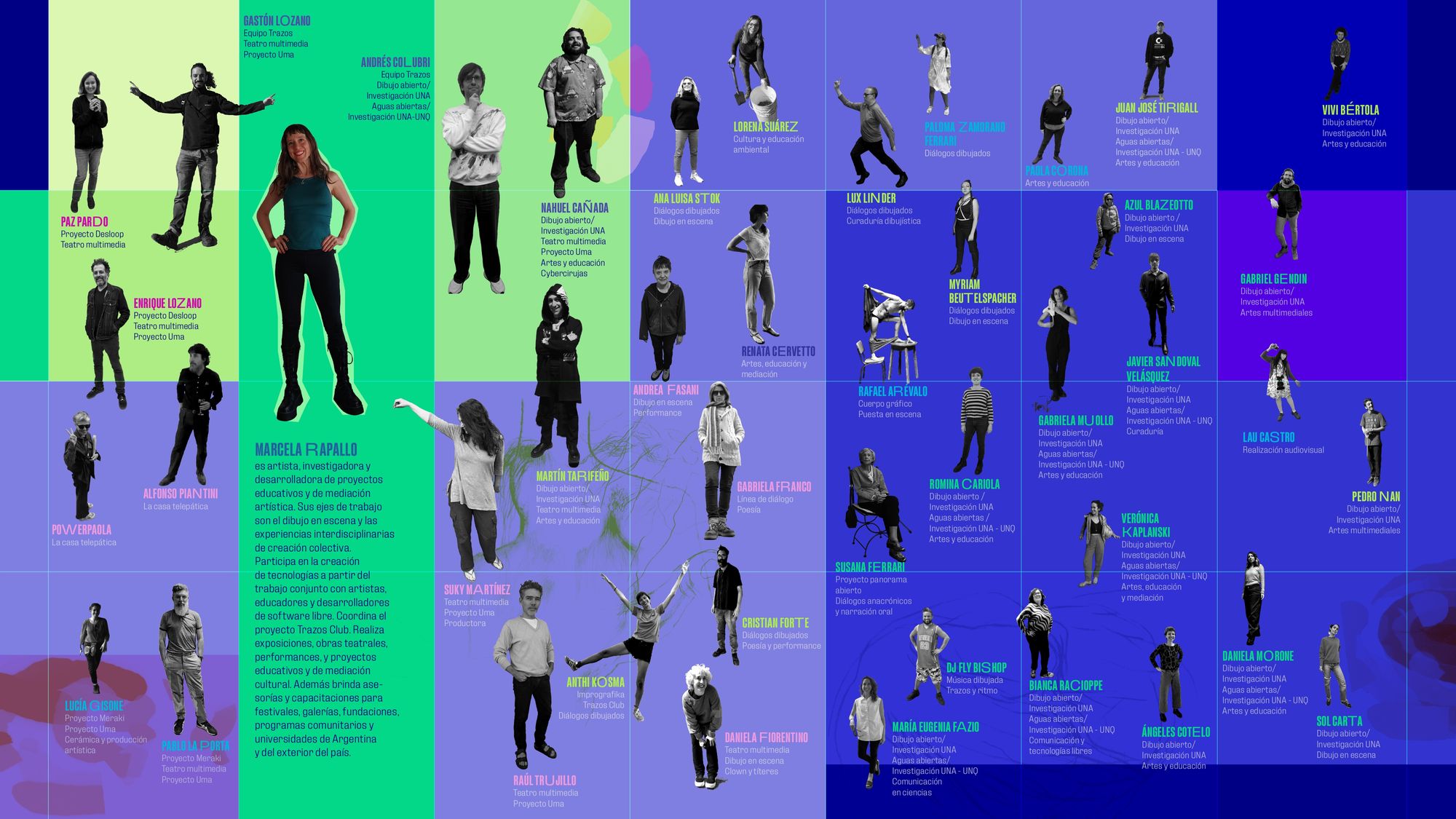 Marcela Rapallo es artista, investigadora y educadora, y combina todas estas facetas en proyectos de múltiples grupos y redes de trabajo, cuyos ejes son el dibujo escénico, la animación en tiempo real, y las experiencias interdisciplinarias de creación colectiva. Forma parte del Equipo Trazos, dedicado a la creación de tecnologías de Software Libre. Realiza exposiciones, obras teatrales, performances, proyectos educativos y de mediación, asesorías y capacitaciones en festivales, galerías, centros culturales, fundaciones, programas comunitarios y socioeducativos, y universidades de Latinoamérica y Europa.