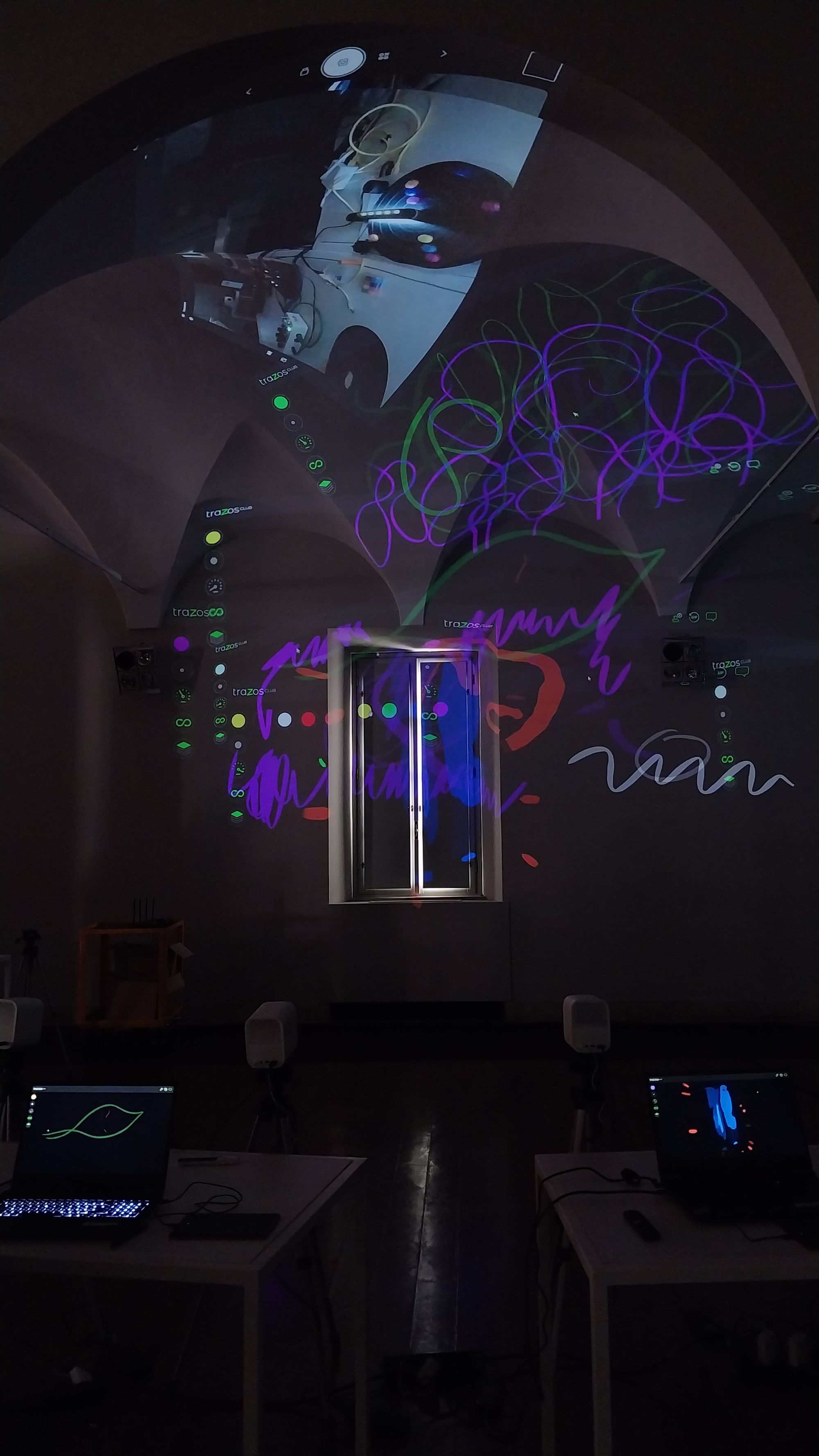 Un taller de dibujo digital y una experiencia colectiva en la que las personas participantes dibujan y animan sus creaciones proyectándolas sobre columnas, ventanas y paredes. A través de Trazos Club, exploran cómo las tecnologías digitales pueden transformar el dibujo a mano alzada en una performance colectiva, desde un enfoque lúdico e interdisciplinario. Las improvisaciones toman forma a medida que las líneas se proyectan y se animan en tiempo real, en diálogo con el lenguaje de la música.